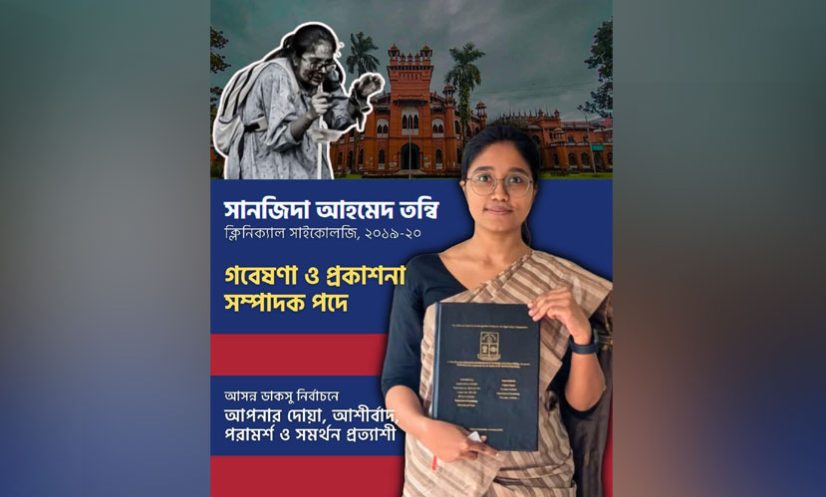 ঢাকা: ঢাকা বিশ্ববিদ্যালয় কেন্দ্রীয় ছাত্র সংসদ (ডাকসু) নির্বাচনে গবেষণা ও প্রকাশনা বিষয়ক সম্পাদক পদে প্রতিদ্বন্দ্বিতা করবেন চব্বিশের জুলাই আন্দোলনে ছাত্রলীগের হামলায় আহত সানজিদা আহমেদ তন্বী। তার সম্মানার্থে এ পদে বাংলাদেশ গণতান্ত্রিক ছাত্র সংসদের (বাগছাস) কেউ মনোনয়ন ফরম কিনবেন না বলে সংগঠনটির পক্ষ থেকে জানানো হয়েছে।