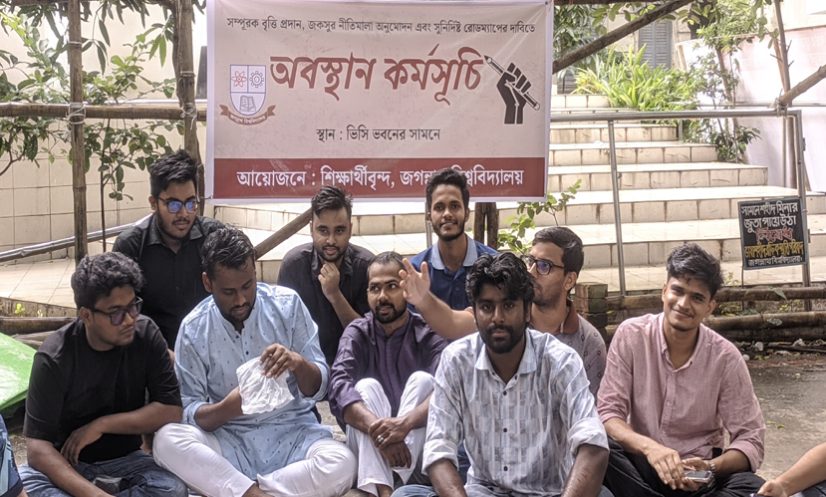 শিক্ষার্থীদের সম্পূরক বৃত্তি প্রদান এবং জগন্নাথ বিশ্ববিদ্যালয় কেন্দ্রীয় ছাত্র সংসদ (জকসু) নির্বাচনের নীতিমালা অনুমোদন ও সুনির্দিষ্ট রোডম্যাপ ঘোষণার দাবিতে অবস্থান কর্মসূচি পালন করছেন জগন্নাথ বিশ্ববিদ্যালয়ের (জবি) শিক্ষার্থীরা।