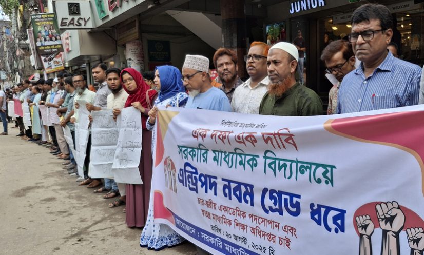 বুধবার (২০ আগস্ট) দুপুরে সরকারি মাধ্যমিক শিক্ষক পরিষদের আয়োজনে প্রেসক্লাবে সামনে ঘন্টাব্যাপি এই মানববন্ধন করা হয়।