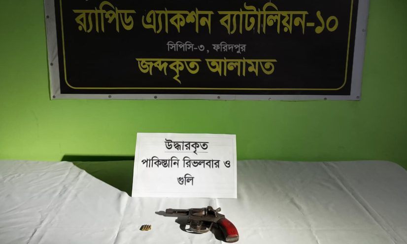 বিজ্ঞপ্তিতে বলা হয়, শনিবার ভোর রাতে জেলার মধুখালী উপজেলার দেনমোহরপুর গ্রামে অভিযান চালানো হয়। এ সময় ইব্রাহিম খান নামে এক ব্যক্তির বাগানের নির্জন ও পরিত্যক্ত স্থানে তল্লাশি চালিয়ে পাকিস্তানি তৈরি রিভলবার ও চার রাউন্ড তাজা গুলি জব্দ করা হয়।