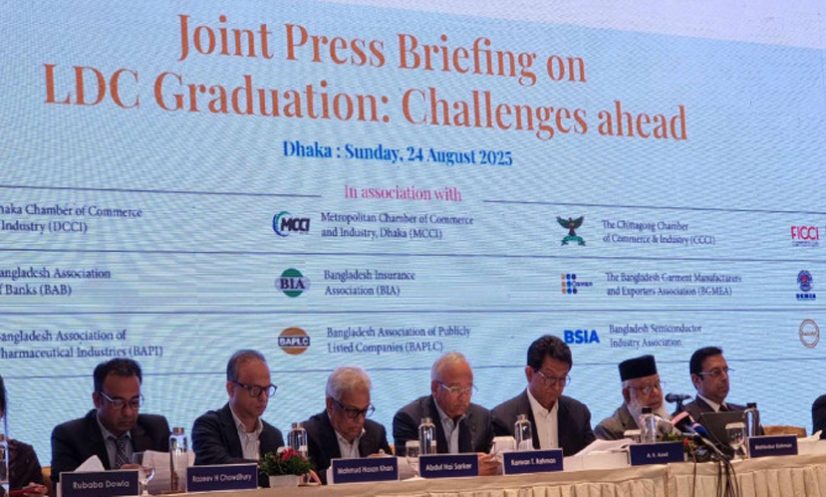 রোববার (২৪ আগস্ট) রাজধানীর একটি হোটেলে আয়োজিত ‘এলডিসি গ্র্যাজুয়েশন: চ্যালেঞ্জেস অ্যাহেড’ শীর্ষক সংবাদ সম্মেলনে এ দাবি জানানো হয়। ইন্টারন্যাশনাল চেম্বার অব কমার্স (আইসিসি) বাংলাদেশ-এর উদ্যোগে আয়োজিত এ সংবাদ সম্মেলনে একাত্মতা প্রকাশ করেছে- এফবিসিসিআই, ডিসিসিআই, এমসিসিআই, সিসিসিআই, এফআইসিসিআই, বিজিএমইএ, বিকেএমইএ, বিটিএমএ, বিএপিআই, বিএসআইএ, বিএবি, বিআইএ, বিএএমএলসি-সহ আরও কয়েককটি সংগঠন।