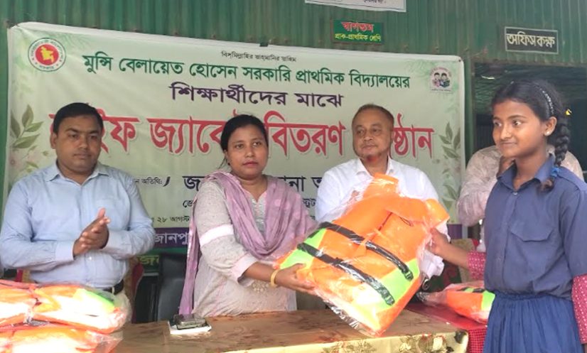 লাইফ জ্যাকেট বিতরণে সদর উপজেলা নির্বাহী কর্মকর্তা মারিয়া হক ও জেলা প্রাথমিক শিক্ষা অফিসার মো. তবিবুর রহমান বক্তব্য দেন।