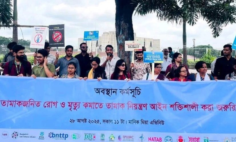 ঢাকা: জনস্বাস্থ্য রক্ষা, অসংক্রামক রোগ প্রতিরোধ ও রাজস্ব বৃদ্ধির স্বার্থে তামাক নিয়ন্ত্রণ আইন সংশোধন ও আরও শক্তিশালী করতে ৮ দাবি জানিয়েছে বাংলাদেশে তামাকবিরোধী কার্যক্রম পরিচালনাকারী সংগঠনগুলো। বৃহস্পতিবার (২৮ আগস্ট) জাতীয় সংসদ ভবনের সামনে ‘তামাকজনিত রোগ ও মৃত্যু কমাতে তামাক নিয়ন্ত্রণ আইন শক্তিশালী করা জরুরি’ শীর্ষক অবস্থান কর্মসূচিতে এসব দাবি জানান তারা।