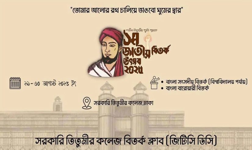 রাজধানীর সরকারি তিতুমীর কলেজের বিতর্ক ক্লাবের উদ্যেগে দুই দিনব্যাপী শহীদ তিতুমীরের স্মরণে ১ম জাতীয় বিতর্ক উৎসব ২০২৫ আয়োজিত হতে যাচ্ছে।