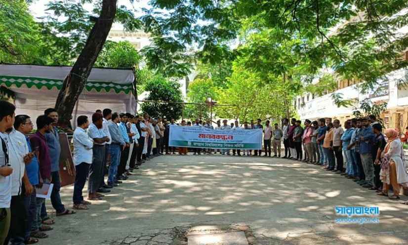 মানববন্ধনে সভাপতিত্ব করেন জবি শিক্ষক সমিতির সভাপতি অধ্যাপক ড. মো. মোশাররাফ হোসেন এবং সঞ্চালনা করেন সাধারণ সম্পাদক অধ্যাপক ড. মো. রইছ উদ্দীন।