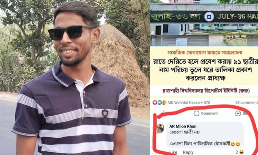 রাজশাহী বিশ্ববিদ্যালয়: রাজশাহী বিশ্ববিদ্যালয়ের (রাবি) জুলাই-৩৬ হলের ৯১ ছাত্রী রাতে দেরিতে ফেরায় হল প্রাধ্যক্ষ অফিসে তলব করে। এ সংক্রান্ত একটি প্রচারিত ফটোকার্ডে ওই ছাত্রীদের ‘যৌনকর্মী’ বলে কমেন্ট করেন বিশ্ববিদ্যালয়ের শাহ মখ্দুম হল শাখা ছাত্রদলের সহ-সভাপতি আনিসুর রহমান মিলন। ফটোকার্ডের নিচে তিনি কমেন্টে লিখেন ‘এগুলো ছাত্রী নয়, এগুলো বিনা পারিশ্রমিক যৌনকর্মী’।