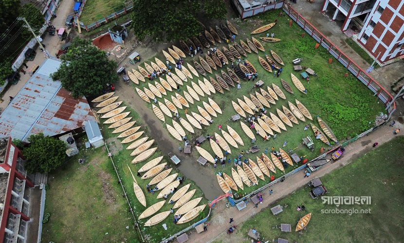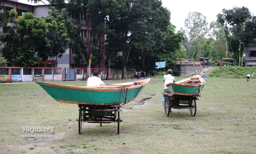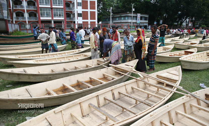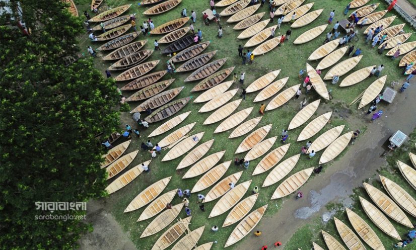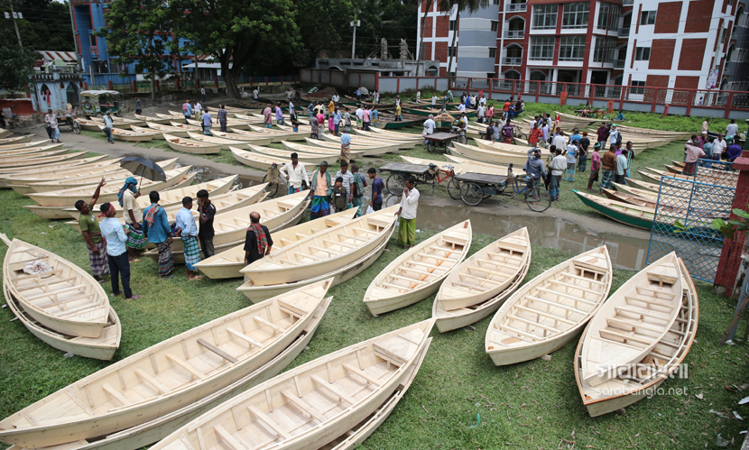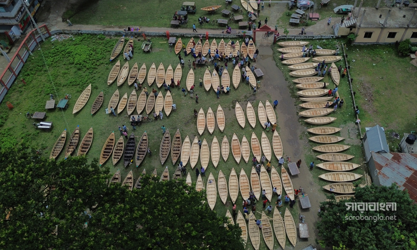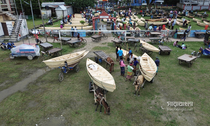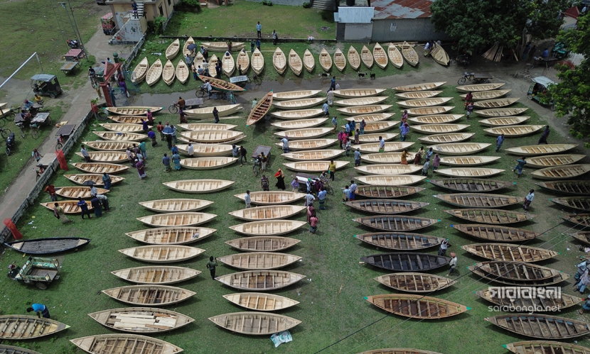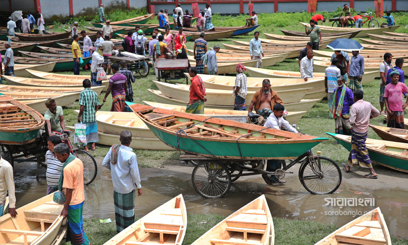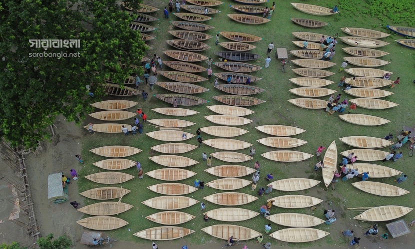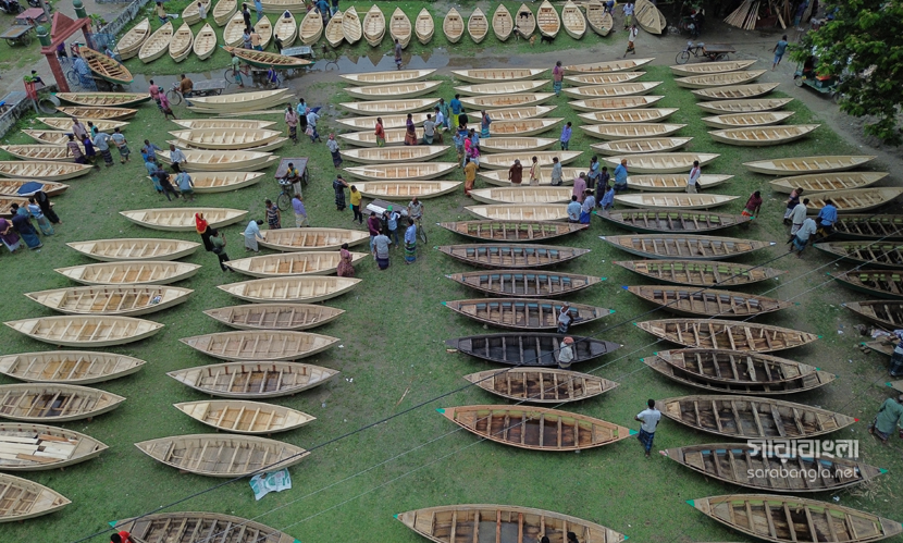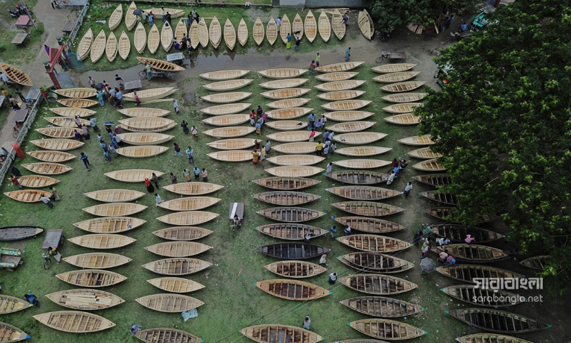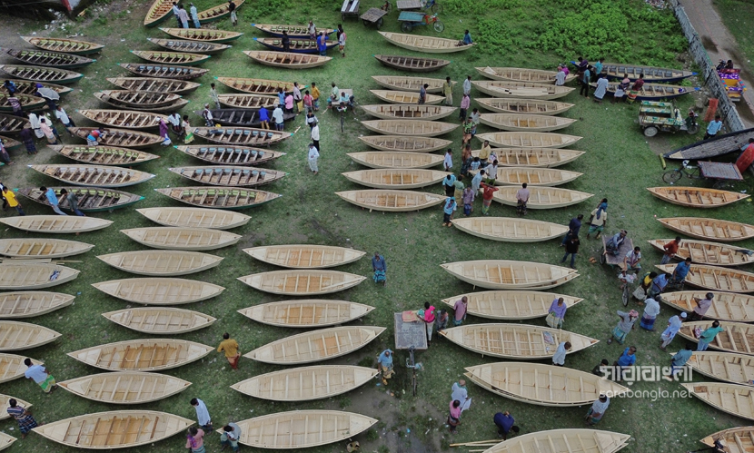 প্রথম দেখায় দৃষ্টিভ্রম হতেই পারে। যে কেউ ভাবতে পারেন ডাঙ্গায় চলছে নৌকা। কিন্তু আদতে তা নয়, এটি মানিকগঞ্জের ঘিওরের শতবছরের ঐতিহ্যবাহী নৌকার হাট। জেলার বেশিরভাগ উপজেলা নদীবেষ্টিত। এছাড়া রয়েছে অসংখ্য খাল-বিল ও ডোবা-নালা। বর্ষার সময় এগুলো পানিতে টইটম্বুর থাকে। তখন চলাচলের প্রধান বাহন হয়ে ওঠে এই নৌকা। আর এ কারণে প্রতি বর্ষায় এই হাট জমজমাট হয়ে ওঠে। কিন্তু এবার বর্ষা সেভাবে আসেনি। সেজন্য হাটে নৌকা বেচাকেনায়ও তেমন প্রভাব নেই। তাতে কি? কারিগররা দূর-দূরান্ত থেকে নৌকা নিয়ে ছুটে আসছেন হাটে। মেহগনি, কড়ই, আম, চাম্বল, রেইনট্রি গাছের কাঠ দিয়ে তৈরি ডিঙি নৌকায় ভরপুর এখন ঘিওরের হাট। আকার ও মানভেদে প্রতিটি নৌকা তিন হাজার থেকে ১০ হাজার টাকায় বিক্রি হচ্ছে। সম্প্রতি এই হাট ঘুরে এসেছেন সারাবাংলার সিনিয়র ফটোকরেসপন্ডেন্ট হাবিবুর রহমান। তার ফ্রেমে ধরা পড়েছে ঘিওরের নৌকার হাটের চালচিত্র।