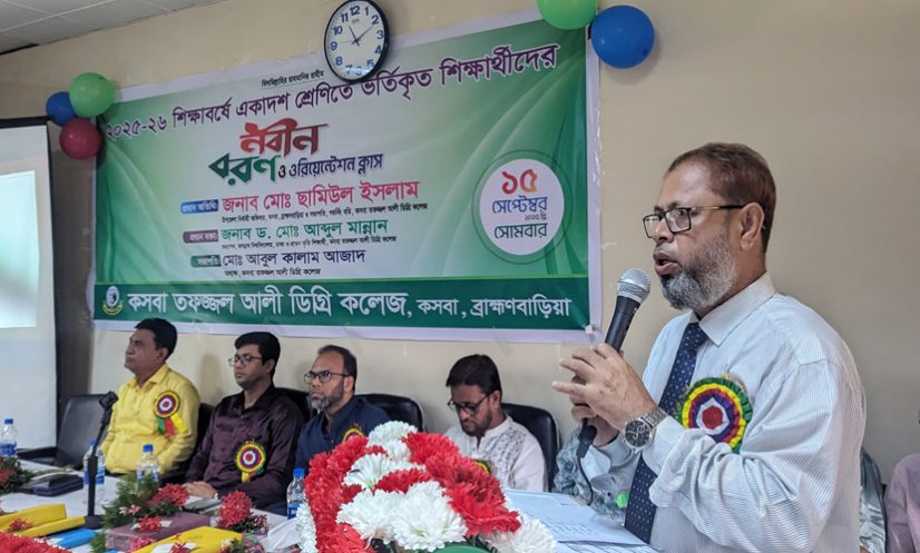 ব্রাহ্মণবাড়িয়া : ব্রাহ্মণবাড়িয়ার কসবা তফজ্জল আলী ডিগ্রি কলেজে একাদশ শ্রেণির শিক্ষার্থীদের নবীন বরণ ও ওরিয়েন্টেশন ক্লাস অনুষ্ঠিত হয়েছে।