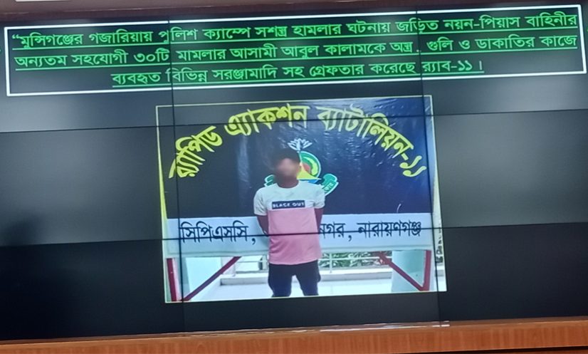 তিনি জানান, মুন্সিগঞ্জের গজারিয়ায় পুলিশ ক্যাম্পে সশস্ত্র হামলার ঘটনায় জড়িত মেঘনার শীর্ষ নৌ-ডাকাত আবুল কালাম-কে অস্ত্র, গুলি ও ডাকাতির কাজে ব্যবহৃত বিভিন্ন সরঞ্জামাদিসহ গ্রেফতার করা হয়েছে।