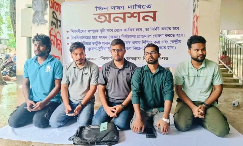 ঢাকা: জগন্নাথ বিশ্ববিদ্যালয়ের (জবি) শিক্ষার্থীদের সম্পূরক বৃত্তি, জগন্নাথ বিশ্ববিদ্যালয় কেন্দ্রীয় ছাত্র সংসদসহ (জকসু) তিন দফা দাবিতে অনশন শুরু করেছেন বিশ্ববিদ্যালয়ের শিক্ষার্থীরা।