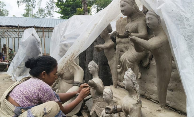 নিজ হাতে প্রতিমা তৈরির পাশাপাশি পূজার সরঞ্জাম তৈরি করছেন নারী শিল্পী