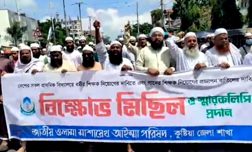 কুষ্টিয়া: দেশের সমস্ত প্রাথমিক বিদ্যালয়ে ধর্মীয় শিক্ষক নিয়োগ এবং গানের শিক্ষক নিয়োগের প্রজ্ঞাপন বাতিলের দাবিতে কুষ্টিয়ায় বিক্ষোভ মিছিল করেছে জাতীয় ওলামা মাশায়েখ আইম্মা পরিষদ, কুষ্টিয়া জেলা শাখা।