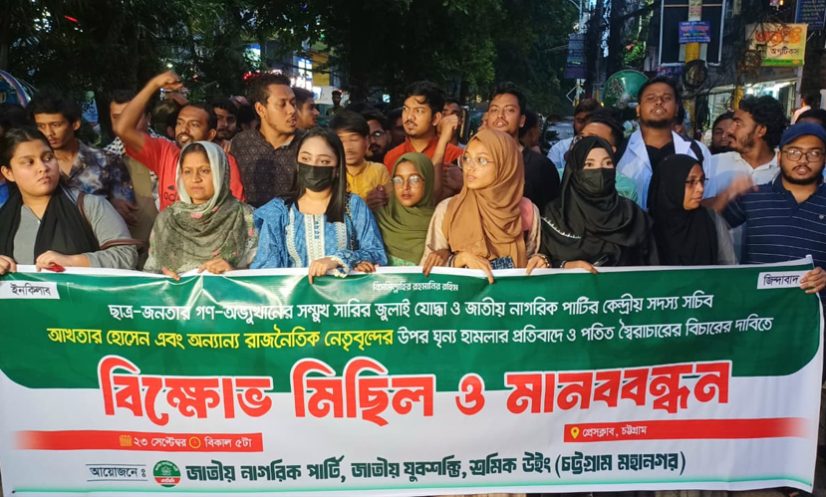 চট্টগ্রাম ব্যুরো: যুক্তরাষ্ট্রের নিউইয়র্কে জাতীয় নাগরিক পার্টির (এনসিপি) সদস্য সচিব আখতার হোসেনের ওপর হামলা এবং যুগ্ম আহ্বায়ক ডা. তাসনিম জারা ও বিএনপি মহাসচিব মির্জা ফখরুল ইসলাম আলমগীরকে হেনস্থার প্রতিবাদে চট্টগ্রামে মানববন্ধন ও মিছিল করেছে দলটি। এসময় এনসিপি নেতারা হামলাকারীদের বাংলাদেশের নাগরিকত্ব ও পাসপোর্ট বাতিল এবং তাদের সম্পদ বাজেয়াপ্তের দাবি জানান।
