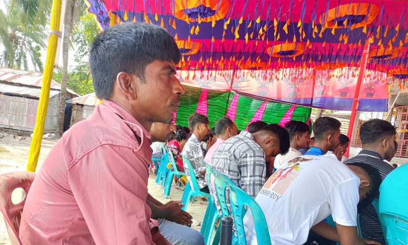 সাতক্ষীরা: সারি সারি চেয়ারে বসে পূজা দিচ্ছেন মায়ের ভক্তরা। এরই মাঝে দেখা যাচ্ছে এক ব্যক্তিকে। যার গায়ে আনসারের পোশাক। হাতে ডিউটিরত লাঠি। এভাবে মায়ের পূজায় অঞ্জলি দিতে আসা ভক্তদের মাঝে সেবা দিয়ে যাচ্ছেন তিনি। কখনো কখনো ভিড় সামলাছেন মন্দিরের বারান্দায় দাঁড়িয়ে, আবার কখনো ভক্তদের অঞ্জলি দেওয়ার জায়গা করে দিচ্ছেন। এভাবে রাত দিন মণ্ডপে ডিউটিরত অবস্থায় পরিশ্রম করে যাচ্ছেন দেবব্রত নামের এই যুবক।