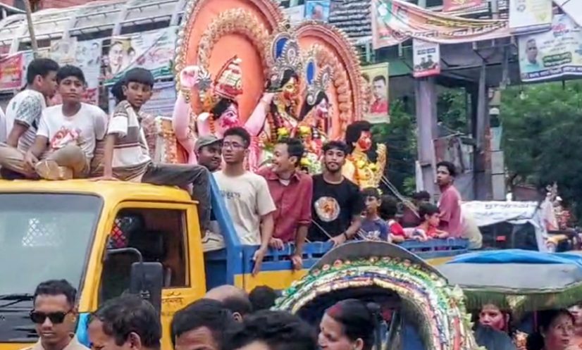 শোভাযাত্রা শুরুর পর থেকেই পথের দুই পাশে দাঁড়িয়ে থাকা হাজারো মানুষ ভক্তিভরে উলুধ্বনি দেন। কেউ শঙ্খ বাজান, কেউবা গেয়ে ওঠেন— ‘বলো দুর্গা মাই কি জয়’, ‘আসছে বছর আবার হবে’। রাজধানীর বিভিন্ন মন্দির থেকে আসা নারী-পুরুষ ভক্তদের চোখে তখন উৎসবের আনন্দের পাশাপাশি ছিল বিদায়ের বেদনা।