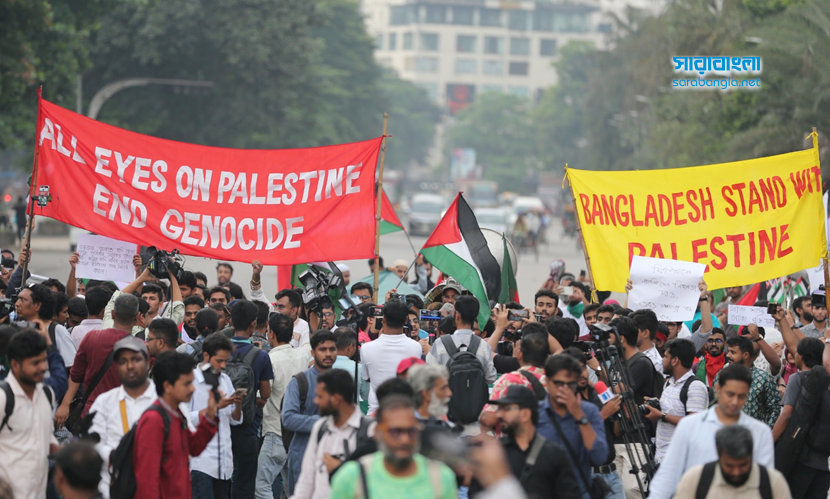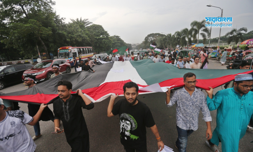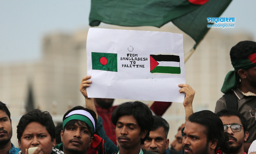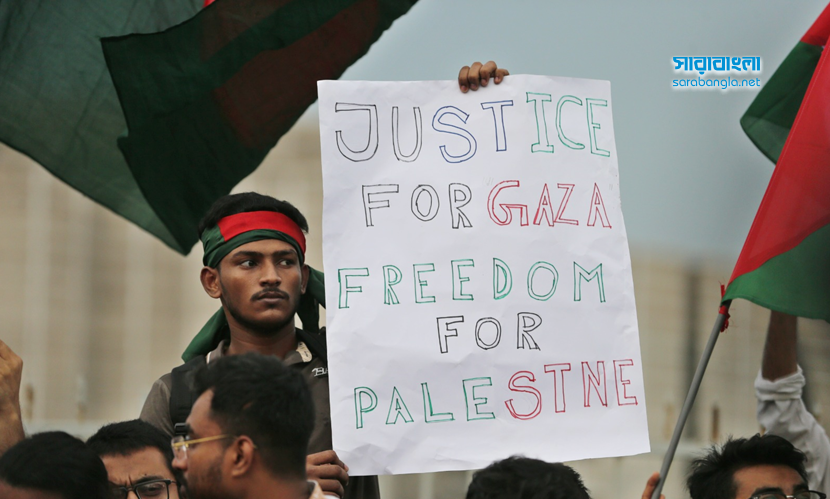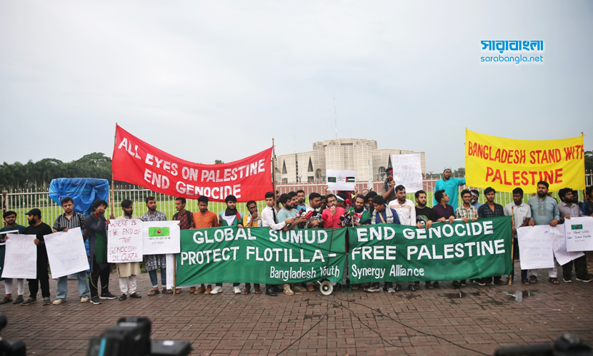 গ্লোবাল সুমুদ ফ্লোটিলা ইসরায়েলের নৌ অবরোধ ভেঙে সমুদ্রপথে গাজায় ত্রাণ নিয়ে যাওয়ার একটি বৈশ্বিক প্রচেষ্টা। এই নৌবহরে ৪০ টির বেশি বেসামরিক নৌযান ছিল, যার সবকটিই আটক করেছে ইসরায়েল। একইসঙ্গে নৌযানে থাকা বিভিন্ন দেশের নাগরিকদের বেশিরভাগকে আটক করেছে দখলদার বাহিনী। এর প্রতিবাদে বিক্ষোভ করেছে বাংলাদেশ ইয়ুথ সিনার্জি অ্যালায়েন্স। তাদের সঙ্গে পরিবেশ, জলবায়ু, মানবাধিকার, সামাজিক, সাংস্কৃতিক, ক্রীড়া ও শিক্ষা এবং স্বেচ্ছাসেবীসহ প্রায় ৭০টি সংগঠনের প্রতিনিধিরা সংহতি প্রকাশ করে অংশ নেন। শুক্রবার (৩ অক্টোবর) বিকেলে ঢাকার মানিক মিয়া এভিনিউ-এ জাতীয় সংসদ ভবনের সামনে অনুষ্ঠিত বিক্ষোভের ছবিগুলো ফ্রেমবন্দি করেছেন সারাবাংলার সিনিয়র ফটোকরেসপন্ডেন্ট হাবিবুর রহমান।