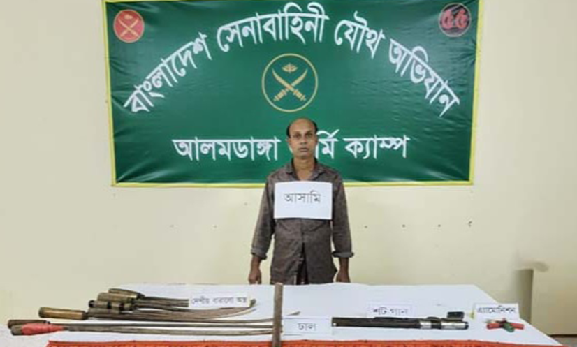 চুয়াডাঙ্গা: চুয়াডাঙ্গার আলমডাঙ্গা উপজেলার কেশবপুর গ্রাম থেকে অভিযান চালিয়ে অস্ত্র ও গুলিসহ সোয়াদ (৩৫) নামে এক যুবককে আটক করেছে যৌথবাহিনী। শনিবার (৪ অক্টোবর) ভোরে উপজেলার কেশবপুর পূর্বপাড়ায় পুলিশ ও সেনাবাহিনীর অভিযানে তাকে আটক করা হয়।