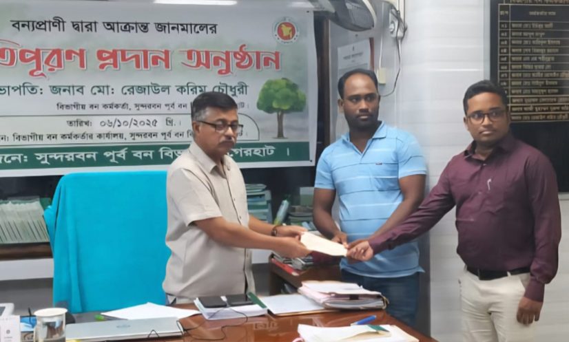 বাগেরহাট: পূর্ব সুন্দরবনে কুমিরের আক্রমণে আহত জেলে সাইফুল জমাদ্দারকে আর্থিক সহায়তা দিয়েছে বন বিভাগ। সোমবার (৬ অক্টোবর) সকালে এক লাখ টাকার ক্ষতিপূরণের চেক তার হাতে তুলে দেওয়া হয়।