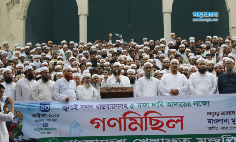 শুক্রবার (১০ অক্টোবর) বাদ জুমা জাতীয় মসজিদ বায়তুল মোকাররমের উত্তর গেটে বাংলাদেশ খেলাফত মজলিস ঢাকা মহানগর উত্তর ও দক্ষিণের যৌথ উদ্যোগে আয়োজিত এক সমাবেশে প্রধান অতিথির বক্তব্যে তিনি এ দাবি জানান।