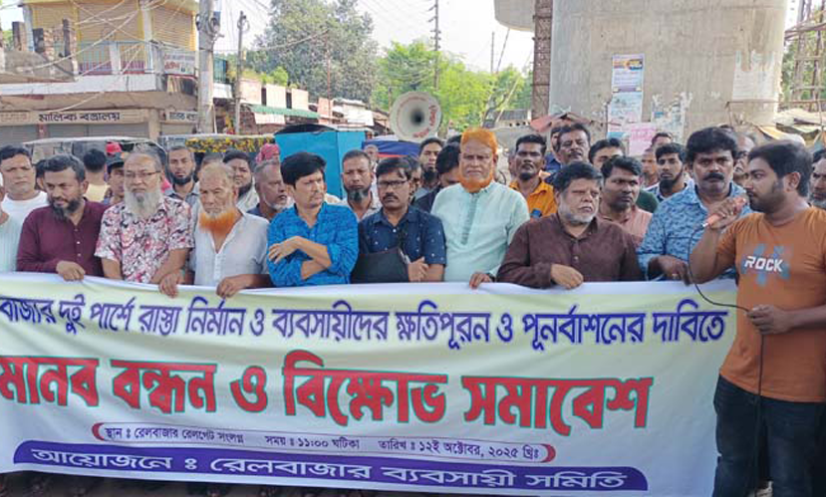 মানববন্ধনে বক্তারা বলেন, দীর্ঘ দুই বছরেরও বেশি সময় ধরে রেলবাজারে ওভারপাস নির্মাণের কাজ চলছে ধীরগতিতে। এ কারনে এই জনপদের ব্যবসায়ীসহ রাস্তা দিয়ে চলাচলকারী জনসাধারণ অবর্ণনীয় দুর্ভোগের শিকার হয়েছে। নির্মাণ কাজ দ্রুত শেষ করার জন্য বারবার প্রশাসন, সড়ক বিভাগ ও সংশ্লিষ্ট ঠিকাদারের প্রতি অনুরোধ করা হলেও তারা বিষয়টি গুরুত্বের সঙ্গে বিবেচনা করছে না। যার ফলে দুর্ভোগের মাত্রা দিন দিন বেড়েই চলেছে। এসময় সীমাহীন কষ্ট লাঘবের জন্য দ্রুত কাজ শেষ করার অনুরোধ জানান বক্তারা।