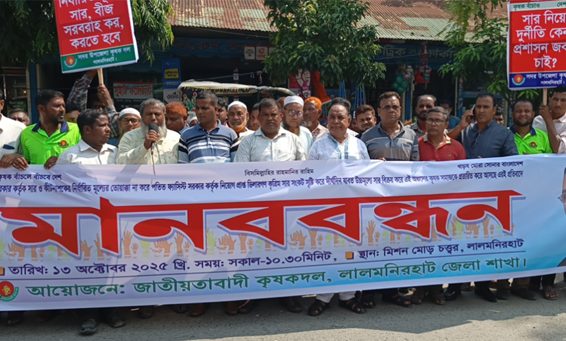 লালমনিরহাট জেলা কৃষক দলের সভাপতি নুরুন্নবী মোস্তফার সভাপতিত্বে এবং সাধারণ সম্পাদক আব্রাহাম লিংকনের সঞ্চালনায় অনুষ্ঠিত এই মানববন্ধনে বক্তারা বলেন, ‘কৃষি ও কৃষক বাঁচলে দেশ বাঁচবে। অথচ আজ এই সরকার কৃষকদের বাঁচিয়ে রাখতে ব্যর্থ। ডিলারদের একটি প্রভাবশালী সিন্ডিকেট সরকারের নীতিমালার তোয়াক্কা না করে ইচ্ছামতো মূল্য নির্ধারণ করছে। এই কৃত্রিম সংকট চাষিদের উৎপাদন খরচকে আকাশছোঁয়া করে তুলছে, যার ফলে প্রান্তিক কৃষকেরা দিশেহারা।’