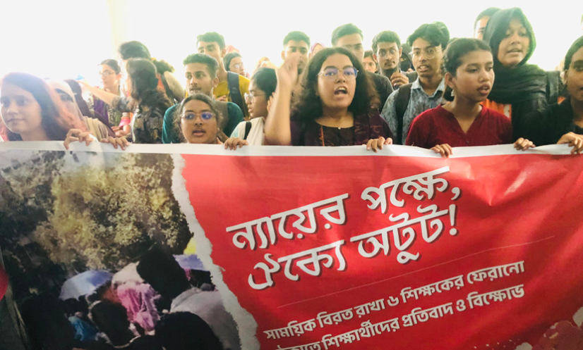 ঢাকা: জুলাই গণঅভ্যুত্থানের বিরোধিতা ও আন্দোলনকারী শিক্ষার্থীদের হুমকি দেওয়ার অভিযোগে সাময়িক বিরত রাখা ৬ শিক্ষকের ফেরানো ঠেকাতে প্রতিবাদ ও বিক্ষোভ করেছে ঢাকা বিশ্ববিদ্যালয়ের (ঢাবি) সমাজবিজ্ঞান অনুষদের শিক্ষার্থীরা।