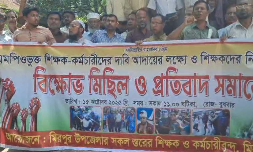 কুষ্টিয়া: এমপিওভুক্ত শিক্ষক-কর্মচারীদের তিন দফা দাবি বাস্তবায়ন ও শিক্ষকদের ওপর নির্যাতনের প্রতিবাদে কুষ্টিয়ার মিরপুরে বিক্ষোভ মিছিল ও সমাবেশ অনুষ্ঠিত হয়েছে।