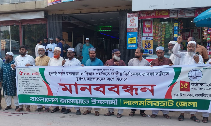 মানববন্ধনে জেলা জামায়াতের আমীর বলেন, ‘জুলাই সনদের ভিত্তিতে জাতীয় নির্বাচন, নির্বাচনে উভয় কক্ষে পিআর পদ্ধতি চালু, অবাধ, সুষ্ঠু ও গ্রহণযোগ্য নির্বাচনের জন্য লেভেল প্লেয়িং ফিল্ড নিশ্চিত করতে হবে।’ এছাড়া, ফ্যাসিস্ট আওয়ামীলীগ সরকারের জুলুম-নির্যাতন, গণহত্যা ও দুর্নীতির বিচারের ব্যবস্থা, স্বৈরাচারপন্থী দলসমূহ বিশেষ করে জাতীয় পার্টি ও ১৪ দলীয় জোটের কার্যক্রম নিষিদ্ধের দাবী জানান তিনি।