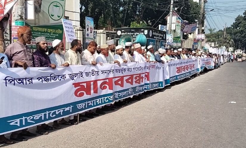 পিআর পদ্ধতিতে নির্বাচনসহ পাঁচ দফা দাবিতে আজ দেশের বিভিন্ন জেলায় মানববন্ধন কর্মসূচি পালন করেছে জেলা জামায়াতে ইসলামী।