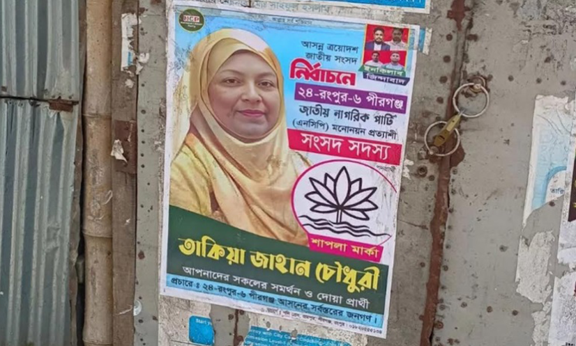 রংপুরের পীরগঞ্জের বিভিন্ন এলাকা ও সড়কপথে হঠাৎ করে দেখা গেছে এক নির্বাচনী পোস্টার; যেখানে শাপলা ফুলের প্রতীকসহ এক নারীর হাস্যোজ্জ্বল ছবি। ভেন্ডাবাড়ীসহ আশপাশের এলাকায় ছড়িয়ে-ছিটিয়ে থাকা এই পোস্টারগুলোতে স্পষ্ট লেখা রয়েছে ‘আসন্ন ত্রয়োদশ জাতীয় সংসদ নির্বাচনে ২৪-রংপুর-৬ পীরগঞ্জ জাতীয় নাগরিক পার্টির (এনসিপি) মনোনয়নপ্রত্যাশী সংসদ সদস্য প্রার্থী (শাপলা মার্কা) তাকিয়া জাহান চৌধুরী আপনাদের সবার সমর্থন ও দোয়া প্রার্থী।’ এমন পোস্টার নির্বাচনি আইনের সীমা লঙ্ঘন করে বিতর্কের ঝড় তুলেছে।