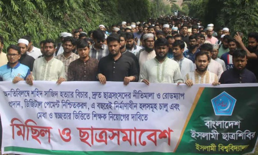 শাখা ছাত্রশিবির সভাপতি মাহমুদুল হাসান বলেন, ‘বিশ্ববিদ্যালয়ের এমনও ডিপার্টমেন্ট আছে, যে ডিপার্টমেন্টে ব্যাচ সংখ্যা হচ্ছে পাঁচটি কিন্তু তাদের শিক্ষক মাত্র দুইজন বা তিনজন। আপনারা বলছেন সেশনজটকে জাদুঘরে পাঠাবেন, আপনারা বলছেন সেশনজট মুক্ত করবেন, কিন্তু কার্যকর পদক্ষেপ না নিলে কীভাবে সেশনজট মুক্ত হবে? ১৫ বছরে যারা শাহবাগকে এসটাব্লিশ করে এদেশের আইন-কানুন, এদেশের বিচার ব্যবস্থাকে প্রশ্নবিদ্ধ করেছে, তাদেরকে আমরা শিক্ষক হিসেবে চাই না। যারা গণহত্যাকে সমর্থন দিয়েছে, যারা গণহত্যার পক্ষে সাফাই দিয়েছে, তাদের থেকে আমরা শিক্ষা নিতে চাই না, যারা আওয়ামী সন্ত্রাসীদেরকে প্রতিষ্ঠিত রাখার জন্য জান-প্রাণ বাজি রেখে কাজ করেছে, তাদেরকে আমরা শিক্ষক হিসেবে চাই না। আমরা মেধা ও স্বচ্ছতারভিত্তিতে শিক্ষক নিয়োগ চাই।’
