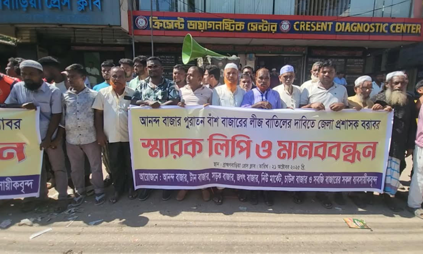 ব্রাহ্মণবাড়িয়া: ব্রাহ্মণবাড়িয়ার শত বছরের পুরোনো ঐতিহ্যবাহী আনন্দ বাজারের বাঁশ বাজার এলাকায় দোকান ইজারা বাতিলের দাবিতে মঙ্গলবার (২১ অক্টোবর) স্থানীয় ব্যবসায়ীরা মানববন্ধন ও বিক্ষোভ মিছিল করেছেন। দুপুরে শহরের প্রেসক্লাবের সামনে এই মানববন্ধন অনুষ্ঠিত হয়। পরে তারা জেলা প্রশাসকের কাছে স্মারকলিপি প্রদান করেন।