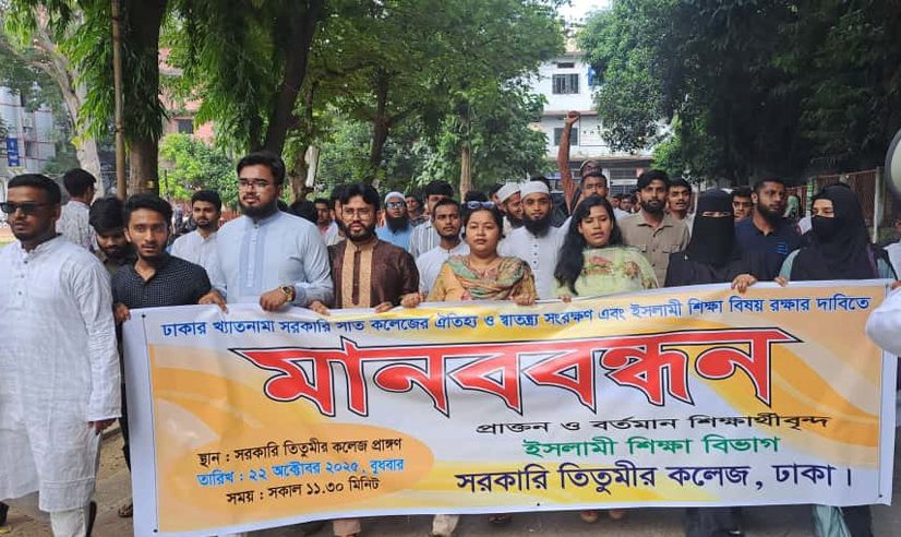 ঢাকার খ্যাতনামা সরকারি সাত কলেজের ঐতিহ্য ও স্বতন্ত্র সংরক্ষণ এবং ইসলামী শিক্ষা বিষয় রক্ষার দাবিতে মানববন্ধন অনুষ্ঠিত হয়েছে। আজ বুধবার বেলা সাড়ে এগারোটায় সরকারি তিতুমীর কলেজের মূল ফটকের সামনে এ মানববন্ধন অনুষ্ঠিত হয়।