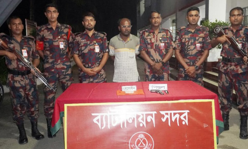 কুষ্টিয়া: কুষ্টিয়ায় সীমান্ত এলাকা থেকে চিহ্নিত অস্ত্র ও মাদক ব্যবসায়ী জামিল মালিথাকে আটক করেছে বর্ডার গার্ড বাংলাদেশ (বিজিবি)। এসময় তার কাছ থেকে একটি বিদেশি পিস্তল, একটি ম্যাগাজিন, একটি গুলি ও ৪৮ গ্রাম হেরোইন জব্দ করা হয়।