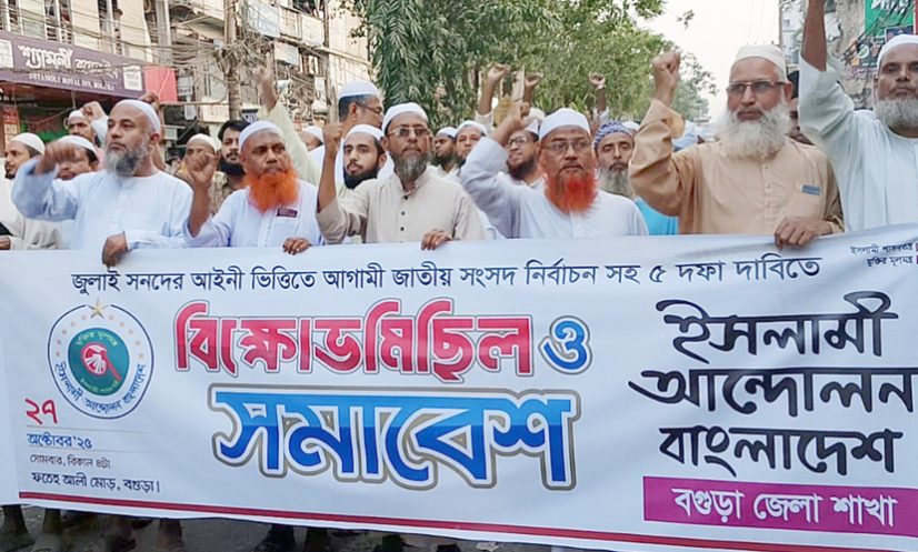 ইসলামী আন্দোলন বাংলাদেশ বগুড়া জেলা শাখার উদ্যোগে সোমবার (২৭ অক্টোম্বর) বিকেলে ফতেহ আলী মোড় থেকে মিছিল বের হয়ে শহরের বিভিন্ন সড়ক প্রদক্ষিণ করে।