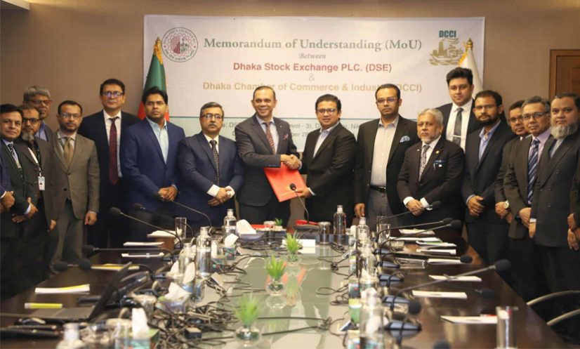 ডিএসই চেয়ারম্যান মোমিনুল ইসলাম ও ডিসিসিআই সভাপতি তাসকীন আহমেদ নিজ নিজ প্রতিষ্ঠানের পক্ষে স্মারকে সই করেন।