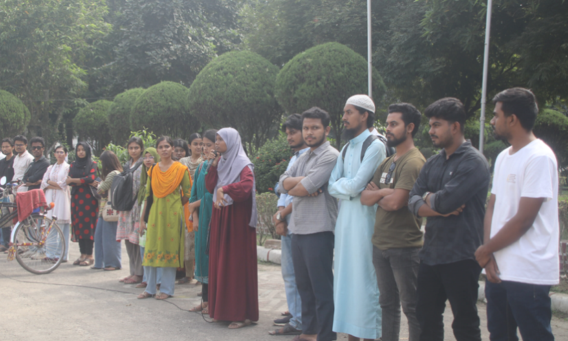 বুধবার (২৯ অক্টোবর) দুপুর ১২টার সময় বিশ্ববিদ্যালয়ের প্রশাসন ভবন চত্বরে তারা এ মানববন্ধন করে। এ সময় বিভিন্ন রাজনৈতিক ছাত্রসংগঠনের নেতাকর্মীসহ প্রায় শতাধিক শিক্ষার্থী উপস্থিত ছিলেন।