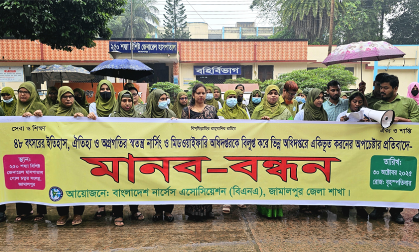 জামালপুর: ৪৮ বৎসরের ইতিহাস, ঐতিহ্য ও অগ্রগতির প্রতীক স্বতন্ত্র নার্সিং ও মিডওয়াইফারি অধিদফতরকে বিলুপ্ত করে ভিন্ন অধিদফতরের সঙ্গে একত্রীকরনের অপচেষ্টার প্রতিবাদে মানববন্ধন করেছে বাংলাদেশ নার্সেস এসোসিয়েশন।