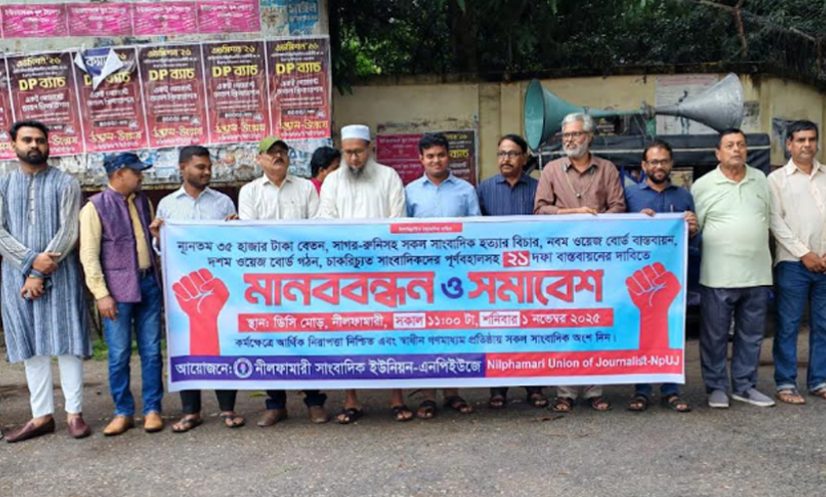 নীলফামারী: সাংবাদিকদের পেশাগত অধিকার নিশ্চিত করা এবং ‘নো ওয়েজ বোর্ড নো মিডিয়া’ নীতি কার্যকরের দাবিতে শনিবার বাংলাদেশ ফেডারেল সাংবাদিক ইউনিয়নের (বিএফইউজে) ঘোষিত কেন্দ্রীয় কর্মসূচির অংশ হিসেবে নীলফামারীতে মানববন্ধন ও সমাবেশ অনুষ্ঠিত হয়েছে। এই সমাবেশের আয়োজন করে নীলফামারী সাংবাদিক ইউনিয়ন (এনপিইউজে)।