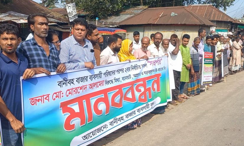 মঙ্গলবার (৪ নভেম্বর) বেলা ১১টার বানিবহ বাজার ব্যবসায়ীদের উদ্যোগে বাজারে ঘণ্টাব্যাপী এই মানববন্ধন অনুষ্ঠিত হয়।