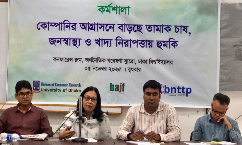 বুধবার (৫ নভেম্বর) ঢাকা বিশ্ববিদ্যালয়ের অর্থনৈতিক গবেষণা ব্যুরো (বিইআর) কনফারেন্স রুমে ‘কোম্পানির আগ্রাসনে বাড়ছে তামাক চাষ, জনস্বাস্থ্য ও খাদ্য নিরাপত্তায় হুমকি’ শীর্ষক কর্মশালায় এ তথ্য তুলে ধরা হয়।