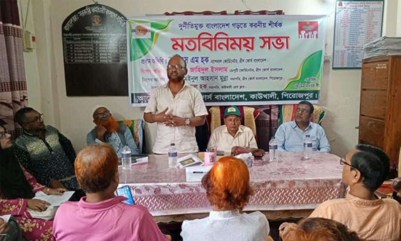 পিরোজপুর: দুর্নীতিমুক্ত বাংলাদেশ গঠনে সামাজিক ও নৈতিক আন্দোলনের গুরুত্ব তুলে ধরে পিরোজপুরের কাউখালী উপজেলাতে অনুষ্ঠিত হয়েছে ‘গ্রীন ফোর্স বাংলাদেশ’-এর মতবিনিময় সভা। শনিবার (৮ নভেম্বর) সকালে উপজেলার অবসর ভবন মিলনায়তনে ‘দুর্নীতিমুক্ত বাংলাদেশ গড়তে করণীয়’-শীর্ষক এ সভার আয়োজন করে গ্রীন ফোর্স বাংলাদেশের কাউখালী শাখা।