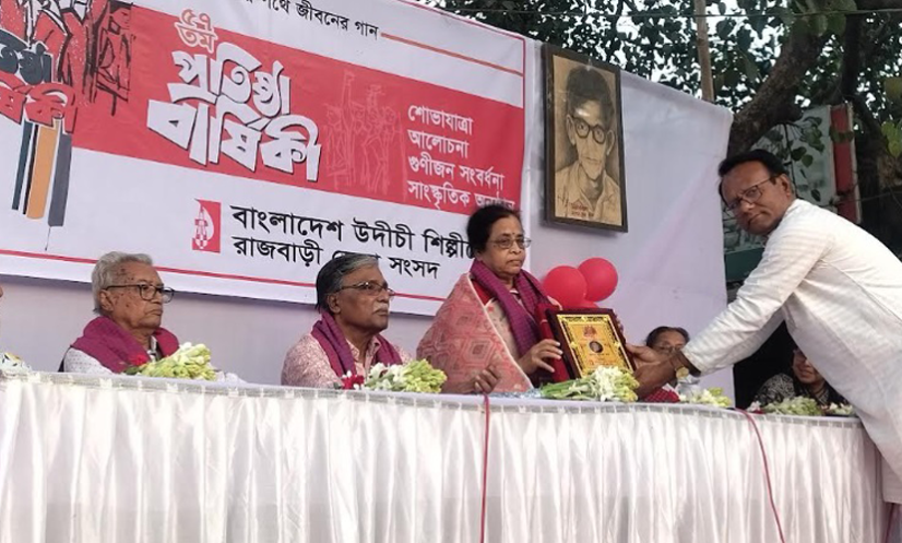 রাজবাড়ী: ‘প্রগতির পথে জীবনের গান’-এই শ্লোগানকে বুকে ধারণ করে রাজবাড়ীতে বাংলাদেশ উদীচী শিল্পী গোষ্ঠীর ৫৬তম প্রতিষ্ঠাবার্ষিকী উদযাপন করা হয়েছে।