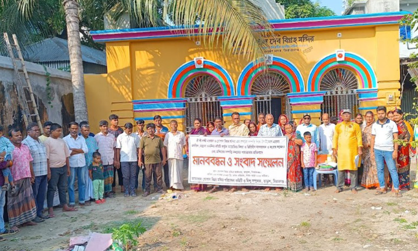 রোববার (৯ নভেম্বর) দুপুর ২টার দিকে উপজেলার শ্রী শ্রী লক্ষ্মী নারায়ণ ও গোপাল বিগ্রহ মন্দির কমিটির আয়োজনে মন্দির প্রাঙ্গণেই এই মানববন্ধন ও সংবাদ সম্মেলন অনুষ্ঠিত হয়।