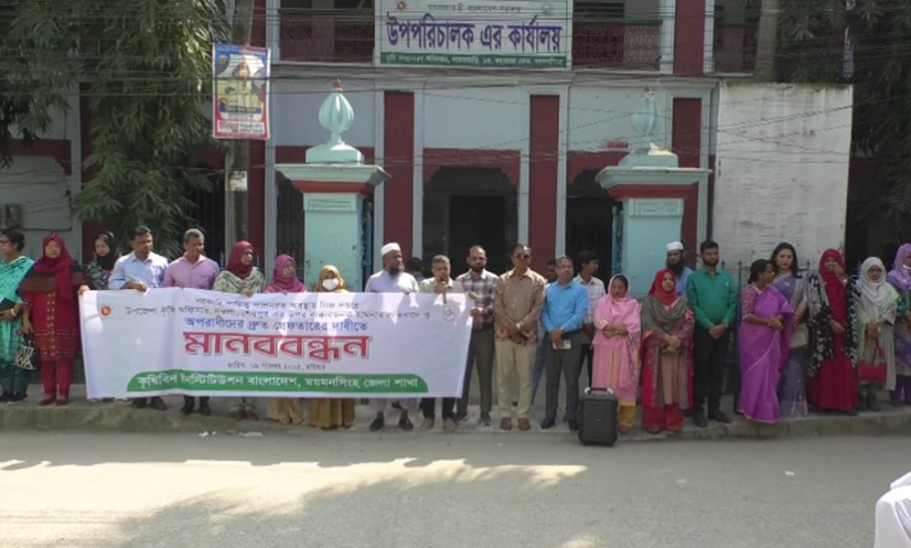 রোববার (৯ নভেম্বর) সকালে নগরীর খামারবাড়ীর সামনে জেলা কৃষি সম্প্রসারণ অধিদফতর ও কৃষিবিদ ইনস্টিটিউশন যৌথভাবে এই মানববন্ধনের আয়োজন করে।