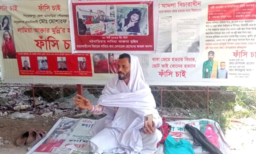 পিরোজপুর: নিজ কন্যা লামিয়া আক্তার মুন্নি (১৫) হত্যার বিচারের দাবিতে কাফনের কাপড় জড়িয়ে আমরণ অনশনে বসেছেন পিরোজপুরের মঠবাড়িয়ার মোশারফ হোসেন হাওলাদার। রোববার (৯ নভেম্বর) সকাল ১১টায় মঠবাড়িয়া সিনিয়র জুডিশিয়াল ম্যাজিস্ট্রেট আদালত প্রাঙ্গণে তিনি এ অনশন শুরু করেন।