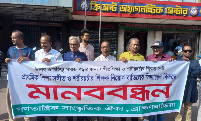 ব্রাহ্মণবাড়িয়া: উদার ও সহিষ্ণু সমাজ গঠনের লক্ষ্যে ‘সঙ্গীতশিক্ষা ও শরীরচর্চার বিকল্প নেই’— এই স্লোগানকে সামনে রেখে ও ধারণ করে গণতান্ত্রিক সাংস্কৃতিক ঐক্যের ব্যানারে মঙ্গলবার (১১ নভেম্বর) সকাল ৯টায় ব্রাহ্মণবাড়িয়া প্রেসক্লাবের সামনে মানববন্ধন অনুষ্ঠিত হয়েছে।