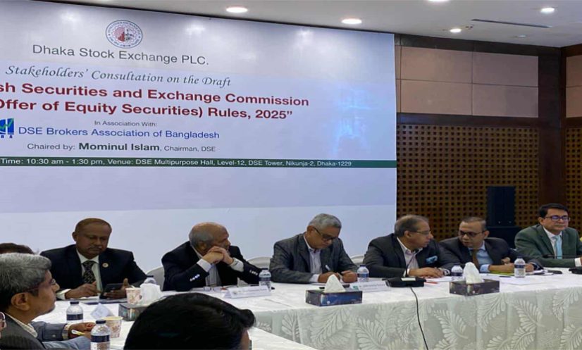 বুধবার (১৯ নভেম্বর) রাজধানীর নিকুঞ্জে ডিএসই টাওয়ারে অনুষ্ঠিত ‘বাংলাদেশ সিকিউরিটিজ অ্যান্ড এক্সচেঞ্জ কমিশন (পাবলিক অফার অব ইক্যুইটি সিকিউরিটিজ) রুলস, ২০২৫’ শীর্ষক স্টেকহোল্ডার বৈঠকে বক্তারা এসব কথা বলেন। ঢাকা স্টক এক্সচেঞ্জ (ডিএসই) ও ডিএসই ব্রোকার্স অ্যাসোসিয়েশন অব বাংলাদেশ (ডিবিএ) যৌথভাবে এ বৈঠকের আয়োজন করে। এতে বাংলাদেশ অ্যাসোসিয়েশন অব পাবলিকলি লিস্টেড কোম্পানিজ (বিএপিএলসি), বাংলাদেশ তৈরি পোশাক প্রস্তুত ও রপ্তানিকারক সমিতির (বিজিএমইএ), ঢাকা চেম্বার অব কমার্স অ্যান্ড ইন্ড্রাস্ট্রি (ডিসিসিআই) ও পুঁজিবাজার সংশ্লিষ্ট স্টেকহোল্ডাররা উপস্থিত ছিলেন।