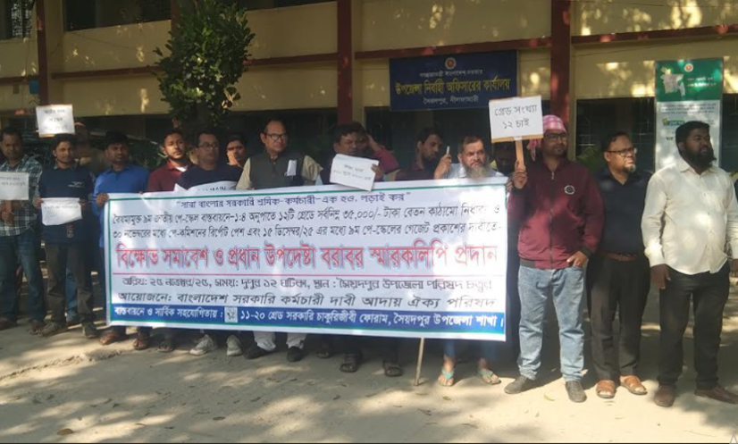 ১১-২০ গ্রেড সরকারি চাকুরিজীবী ফোরামের সহযোগিতায় আয়োজিত এই বিক্ষোভ সমাবেশে সৈয়দপুর রেলওয়ে কারখানা, উপজেলা পরিষদ, পানি উন্নয়ন বোর্ড, বিদ্যুৎ উন্নয়নসহ বিভিন্ন সরকারি দফতরে কর্মরত শতাধিক নারী-পুরুষ অংশগ্রহণ করেন।