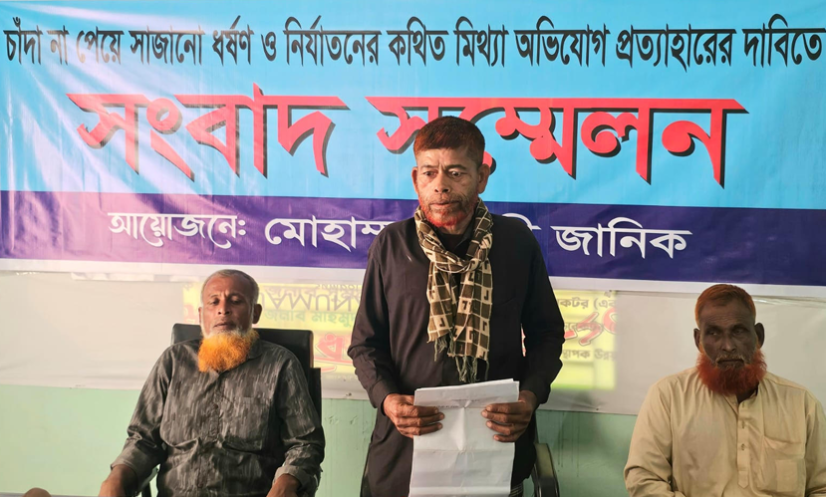 জামালপুর: জামালপুরে চাঁদা না পেয়ে সাজানো ধর্ষণ ও নির্যাতনের অভিযোগে মিথ্যা মামলা প্রত্যাহারের দাবিতে সংবাদ সম্মেলন করেছেন ভুক্তভোগী ৭০ বছরের বৃদ্ধ মোহাম্মদ আলী জানিক।